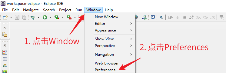 1. 点击上方菜单栏的Windows,然后点击最后一个Preferences,进入Eclipse设置: