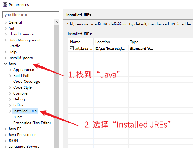 3. 在左侧选项中,找到Java并展开,选择Installed JREs:
