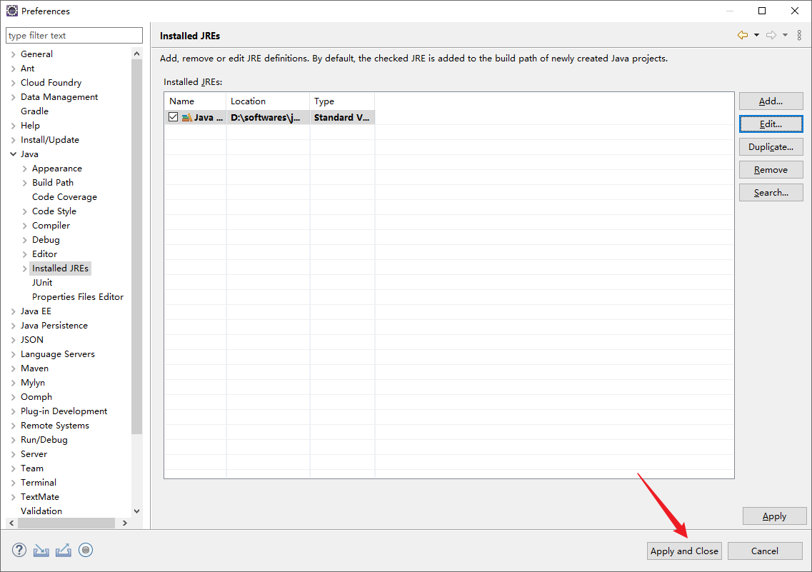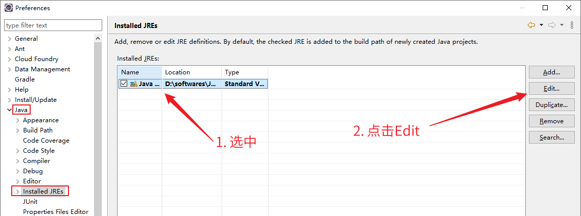 4. 在Installed JREs中,选中系统自带的JRE,然后在右侧点击Edit: