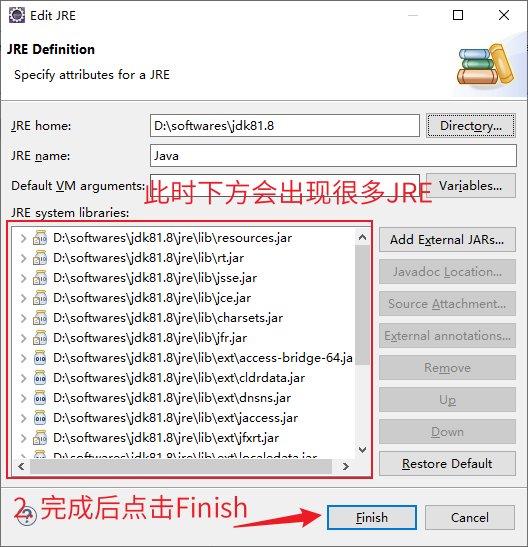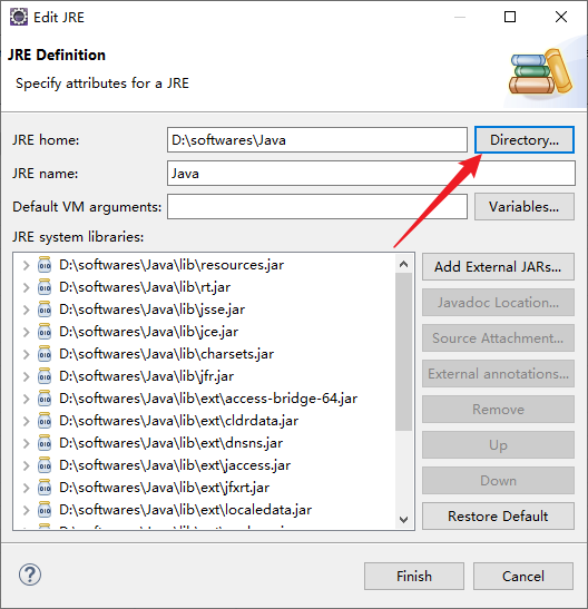5. 点击右上角的Directory,选择JDK安装位置,直到下方出现很多的JRE,然后点击Finish:
