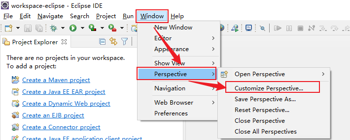 1. 在上方菜单栏点击Window,选择Perspective,然后点击Customize Perspective: