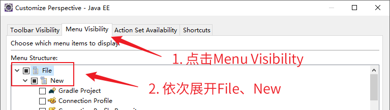 2. 点击Menu Visibilitiy,依次展开File、New: