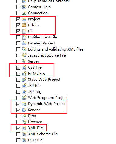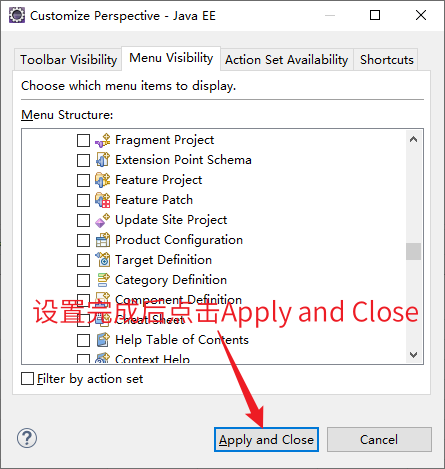3. 这里我勾选了Java常用的项目、文件类型,小白可以按照下图的方式进行勾选即可,完成后点击下方的Apply And Close:
