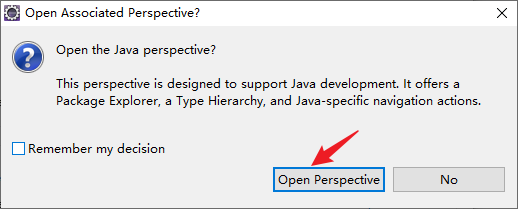 4. 如果出现下图弹窗,点击Open Perspective,此时Eclipse会以Java视图显示: