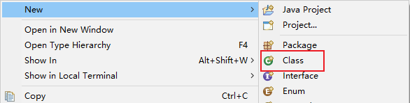 5. 在左侧Package Explorer,双击展开我们的项目MyJavaProject,鼠标右键点击src,点击New,点击Class创建Java文件: