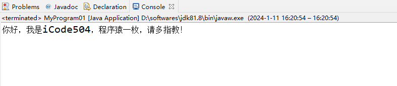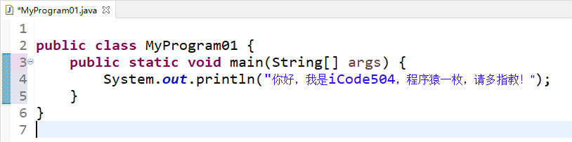 注意:只要左上角页签MyProgram01.java前面会有一个星号标志,这说明我们未保存这个Java文件,需要按Ctrl和S保存。
