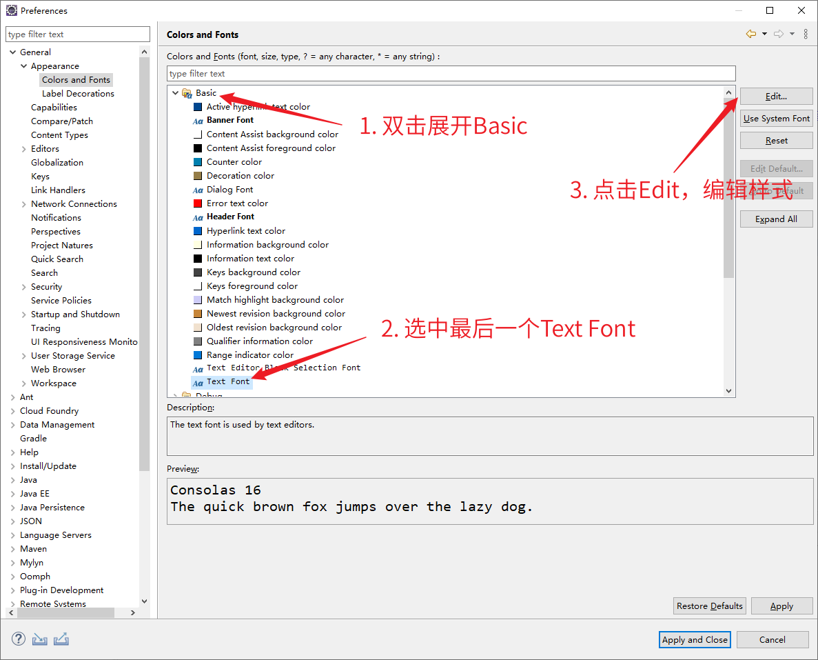 3. 在颜色和字体界面中,双击展开Basic,找到并选中最后一个Text Font,点击Edit: