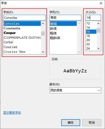 这里我选择的Consolas字体,字体大小16号。下方示例可以预览字体: