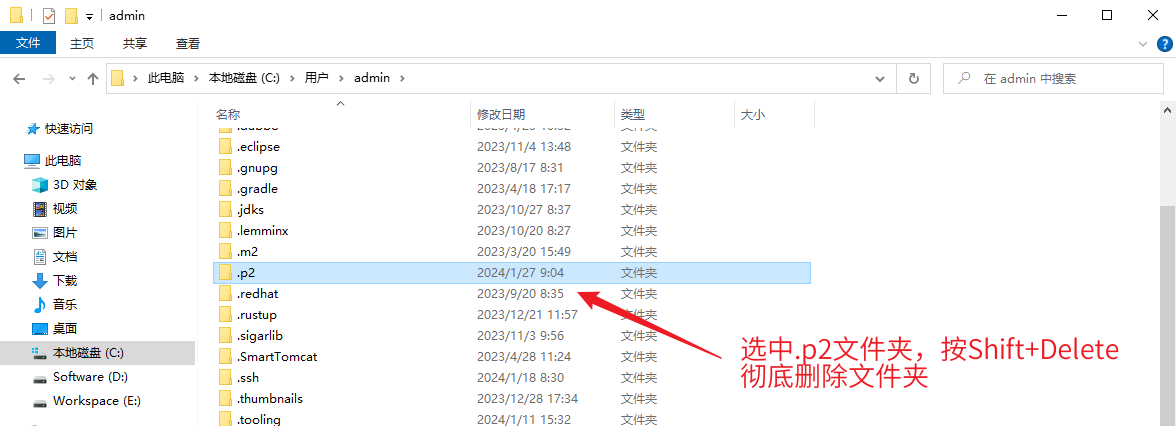 3. 找到.p2文件夹,选中,按ShirtDelete彻底删除: