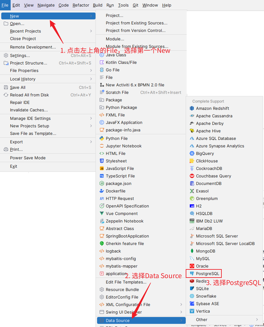 1. 按照下图所示操作,数据源选择PostgreSQL: