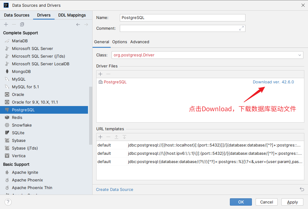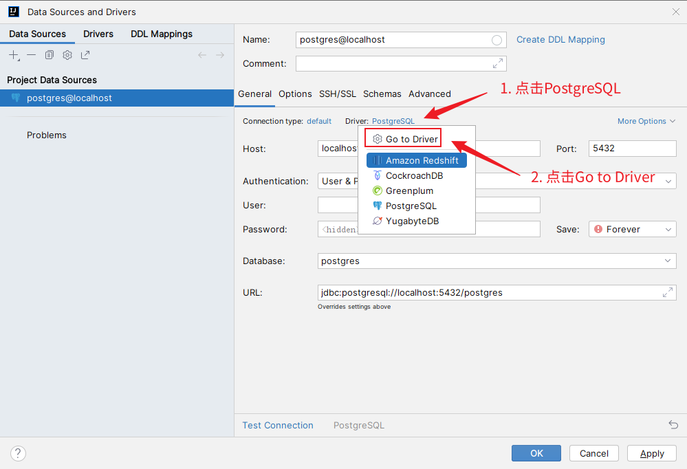 2. 在Driver处,点击PostgreSQL,点击Go to Driver: