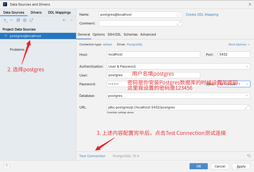 6. 点击左上角的Data Sources。用户名Username输入postgres,密码是你在安装Postgres的时候设置的密码(我当时设置的是123456)。配置完成后,点击左下角的Test Connection测试我们填写的内容是否正确: