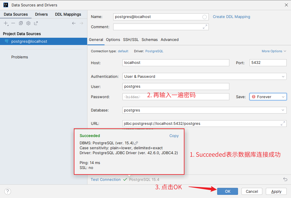 7. 左下角出现Succeeded弹窗表示Postgres连接成功。重新输入一遍密码,点击OK: