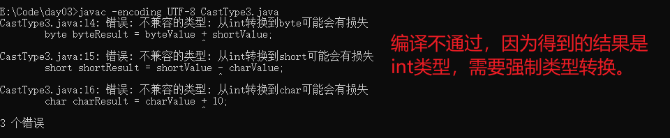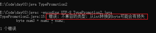 当我们解除一个错误写法的注释(例如byte num3 = num1 + num2;)。我们可以执行javac命令查询错误信息: