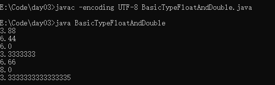 从输出结果中我们还能看出,10 / 3得到的是无限循环小数,但是float类型变量f4输出结果保留了7位小数,而double类型变量d3输出结果保留了15位小数。由这两个输出结果可以印证两个浮点类型的精度大小。