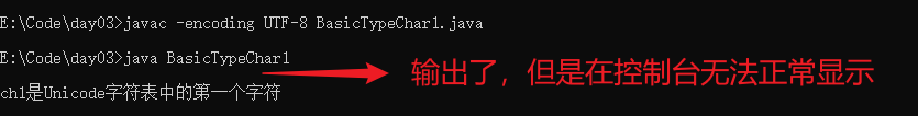 代码中我写了三个输出语句,其中第一个直接输出这个字符,但是从运行结果中我们发现这个语句确实输出了,但是控制台无法显示这个字符。