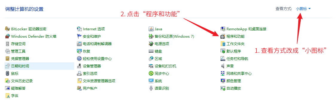 3. 按Win和R键,输入control并回车,右上角查看类别改成小图标,点击程序与功能: