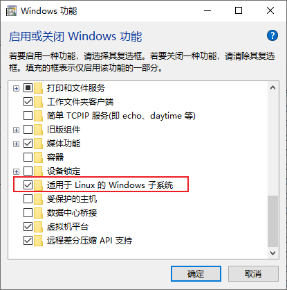 4. 勾选适用于Linux的Windows子系统,完成后点击确定:
