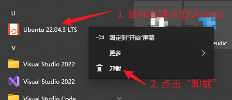 1. 按Win键,找到Ubantu,鼠标右键点击卸载: