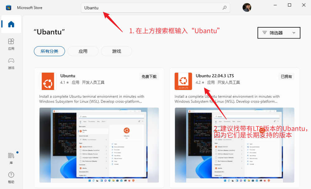 2. 在上方搜索框中输入你想要的Linux发行版,这里我安装的是Ubantu 长期支持版(LTS):