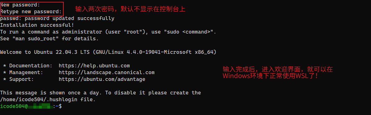 7. 进入输入密码界面,注意密码默认是不显示在控制台的,一共需要输入两次(如果你记不住密码,建议将密码设置成123456)。输入完毕后,你就可以在Windows上正常使用Linux啦!