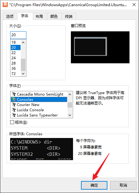 3. 在字体窗口自行调整字体类型和大小,这里我选择的是Consolas字体(Windows自带,挺好看的),大小20号: