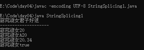 后四个输出结果中我们可以得知:+右侧的基本数据类型自动转换成字符串,然后+对左右两侧的字符串进行拼接形成新的字符串进行输出。