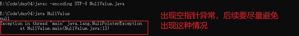 如果引用数据类型的变量值为null,直接调用引用数据类型的方法会产生空指针(NullPointerException,臭名昭著)异常: