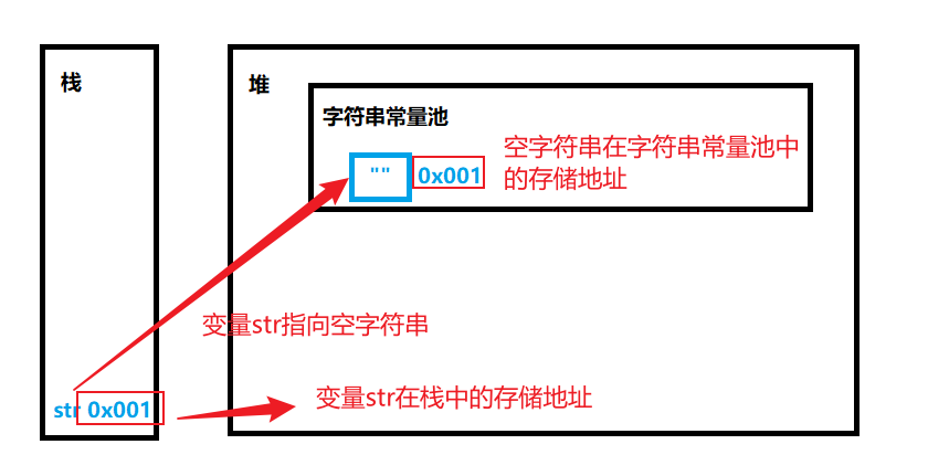 上面代码中,str是指向String对象的引用,而这个String对象在内存中会占用一定的空间,只是它包含的字符数为0。以下是String str = "";在JDK 8版本中,内存简要存储情况图: