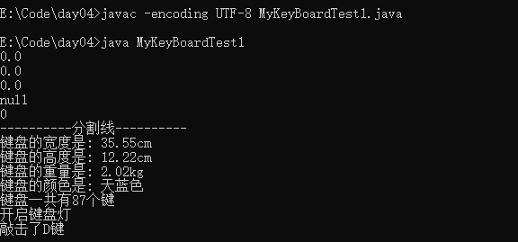 在分割线之前的输出中,我们并没有给每一个属性进行赋值,因此在分割线之前输出的是各种类型的默认值:整数类型默认值是0,浮点类型默认值为0.0,字符类型默认值是Unicode字符表的第一个字符,布尔类型默认值是false,引用数据类型的默认值为null(null在后面会讲到)。