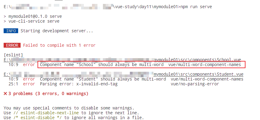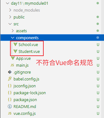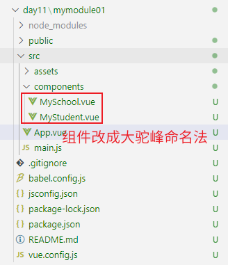 将所有组件中出现的单个单词都修改成多个单词命名(大驼峰命名法或者单词之间使用-做分隔),这里我将我的组件都命名成My+xxx的形式,例如:MySchool、MyStudent: