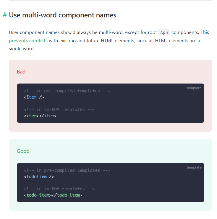 除了App组件以外,其他所有的组件都应该以多个单词组合命名。这样做的目的是避免和HTML自带的标签冲突(因为所有HTML标签都是用单个单词命名)。
