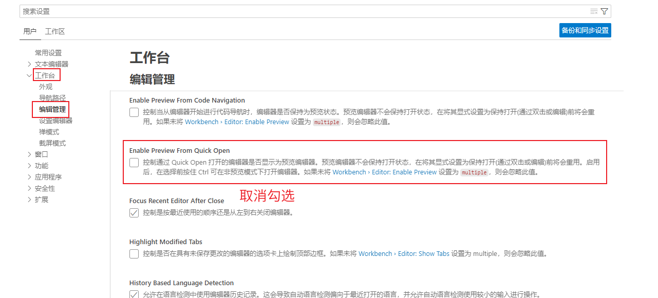 在左侧找到工具台–>编辑管理,将Enable Preview From Quick Open取消勾选:
