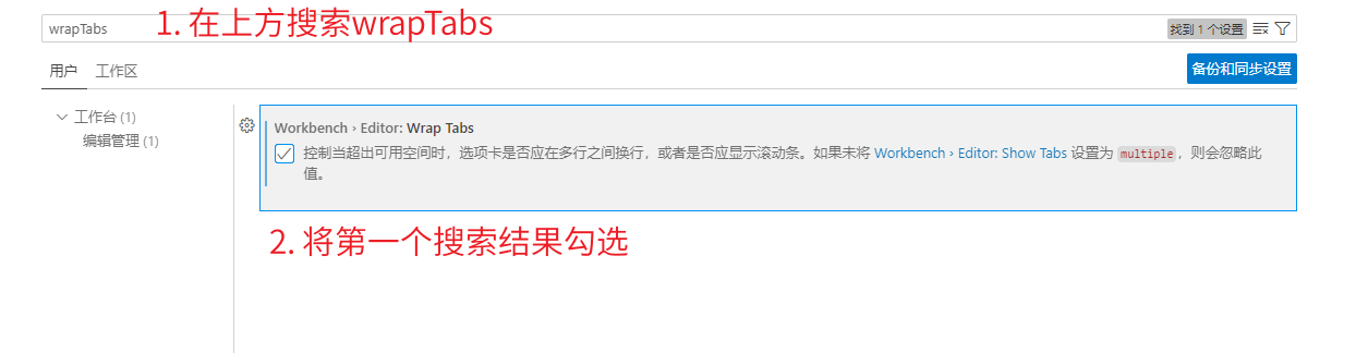 在设置上方搜索框中搜索wrapTabs,将第一个搜索结果Workbench > Editor: Wrap Tabs勾选: