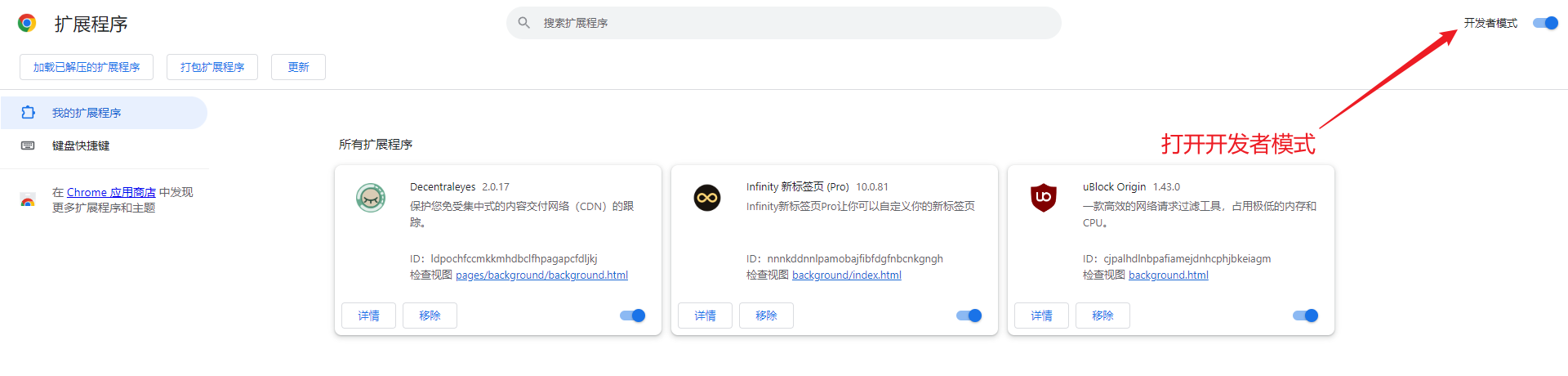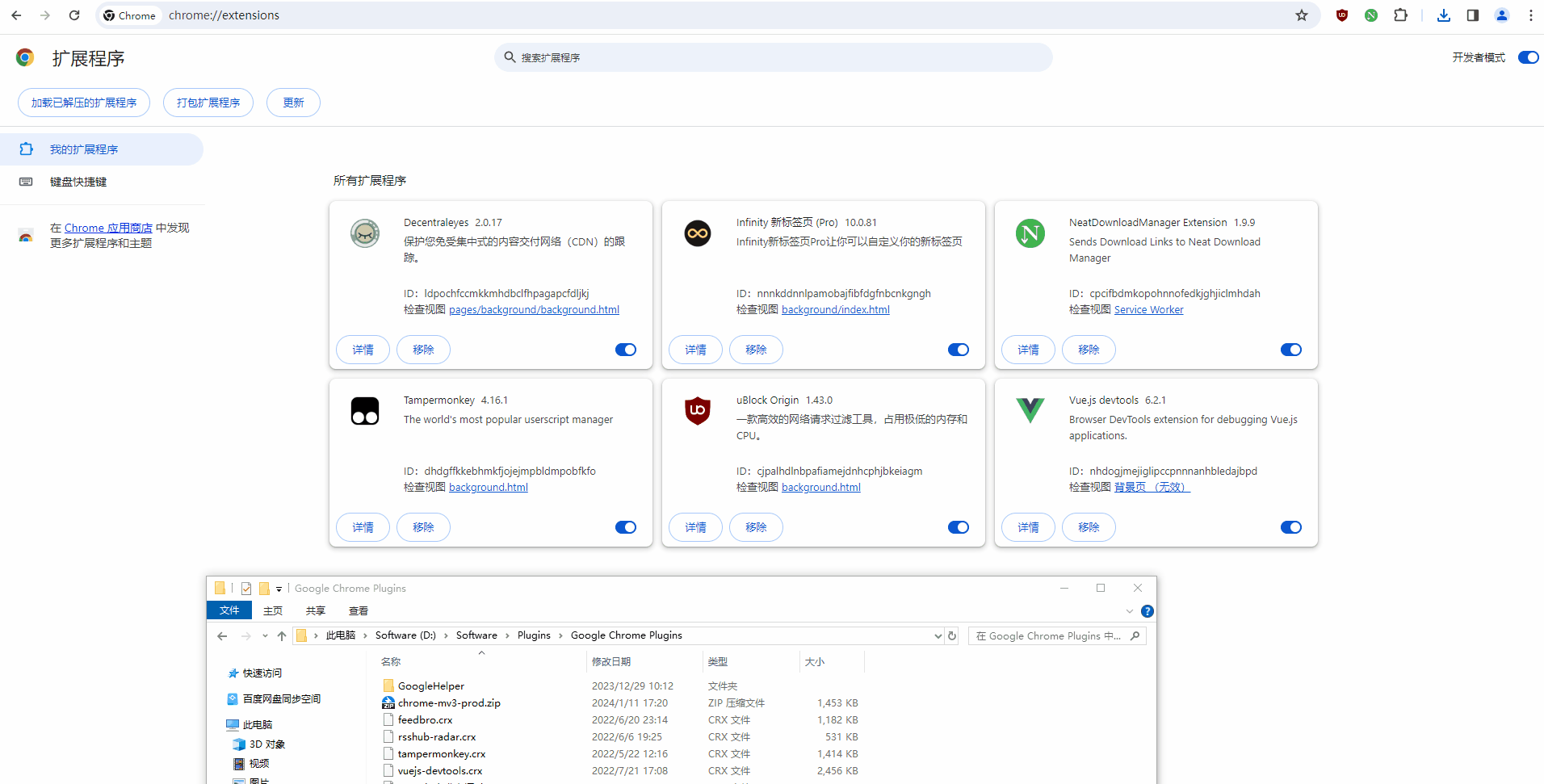3. 将下载好的两个插件依次拖入浏览器的扩展程序中,如果开关打开,就说明两个插件已经安装成功了。