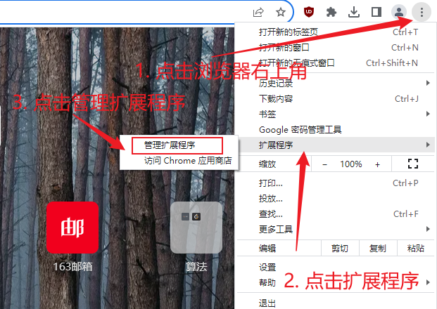 1. 打开谷歌浏览器,按照下图所示打开管理扩展程序: