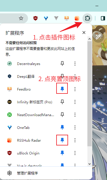 4. 安装完成后,点击右上角的插件图标,将这两个插件置顶显示:
