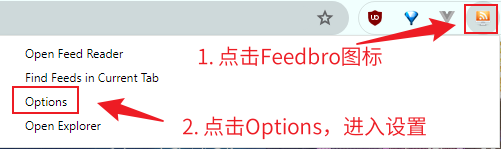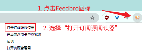 2. 点击Feedbro插件图标,然后点击打开订阅源阅读器: