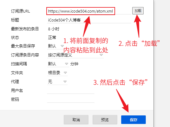 4. 将第一步复制的链接粘贴到订阅源URL,然后点击加载,此时会显示标题内容,然后点击保存: