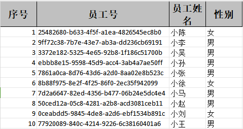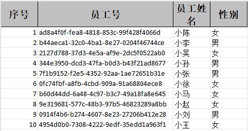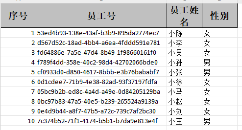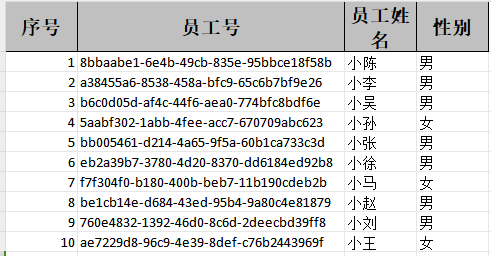 1 2 3 4 5 6 7 8 9 10 11 12 13 14 15 16 17 18 19 @Test public void test () { String filePath = EmployeeUtils.getFilePath(); List<String> list = new ArrayList <>(); list.add("id" ); list.add("employeeId" ); list.add("employeeName" ); list.add("gender" ); EasyExcel.write(filePath, Employee.class) .includeColumnFieldNames(list) .sheet("测试工作表" ) .doWrite(EmployeeUtils.getDataList()); System.out.println("数据成功写出到Excel文件中" ); }