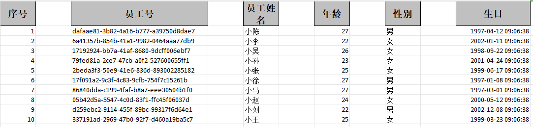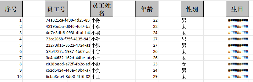 1 2 3 4 5 6 7 8 9 10 11 12 13 14 15 16 17 @Test public void test () { String filePath = EmployeeUtils.getFilePath(); List<String> list = new ArrayList <>(); list.add("age" ); list.add("birthday" ); EasyExcel.write(filePath, Employee.class) .excludeColumnFieldNames(list) .sheet("测试工作表" ) .doWrite(EmployeeUtils.getDataList()); System.out.println("数据成功写出到Excel文件中" ); }