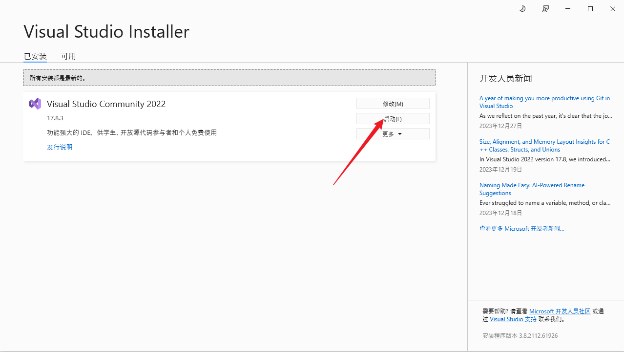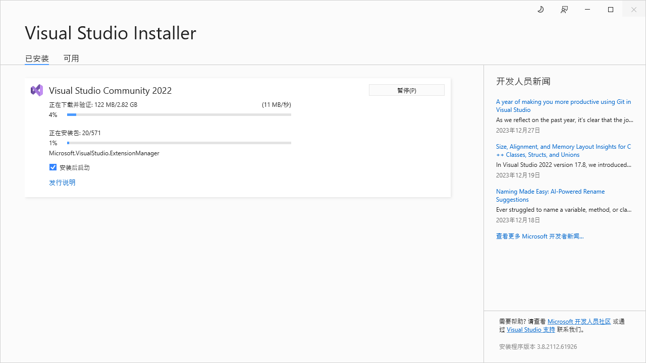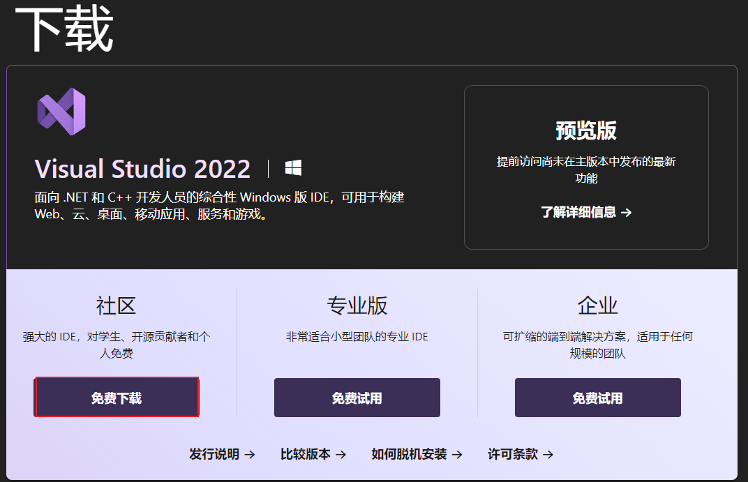 2. 对于个人学习开发,选择社区版的Visual Studio即可。点击左下角的下载按钮,开始下载VS的安装器