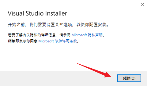 1. 双击打开刚刚下载好的VS安装器,弹出一个小窗口,点击继续: