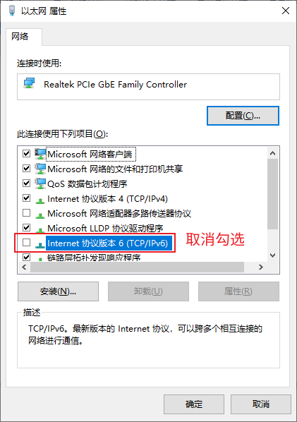 4. 取消勾选Internet 协议版本 6(TCP/IPv6)