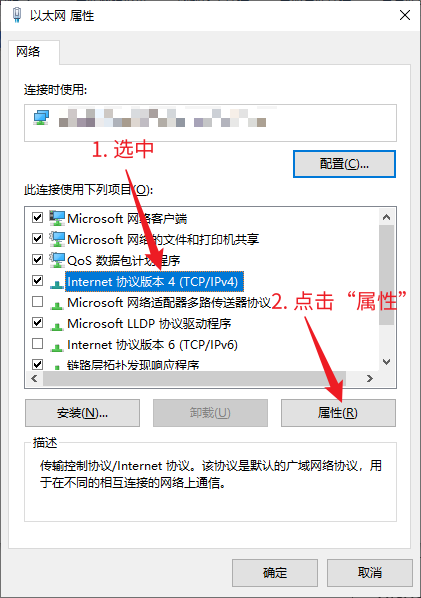 5. 选择Internet协议版本 4(TCP/IPv4),然后点击属性: