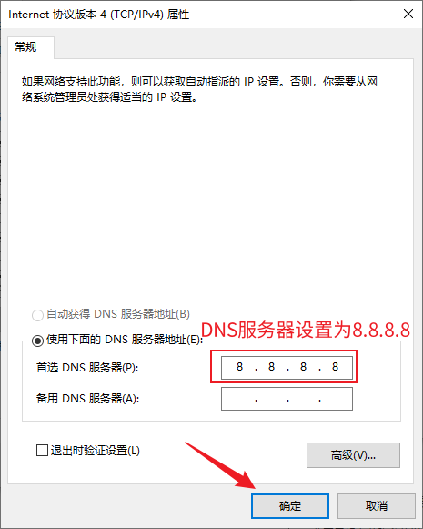 6. DNS服务器服务器地址选择使用下面的DNS服务器地址(下方第二个),首选DNS服务器设置为8.8.8.8,完成后点击确定: