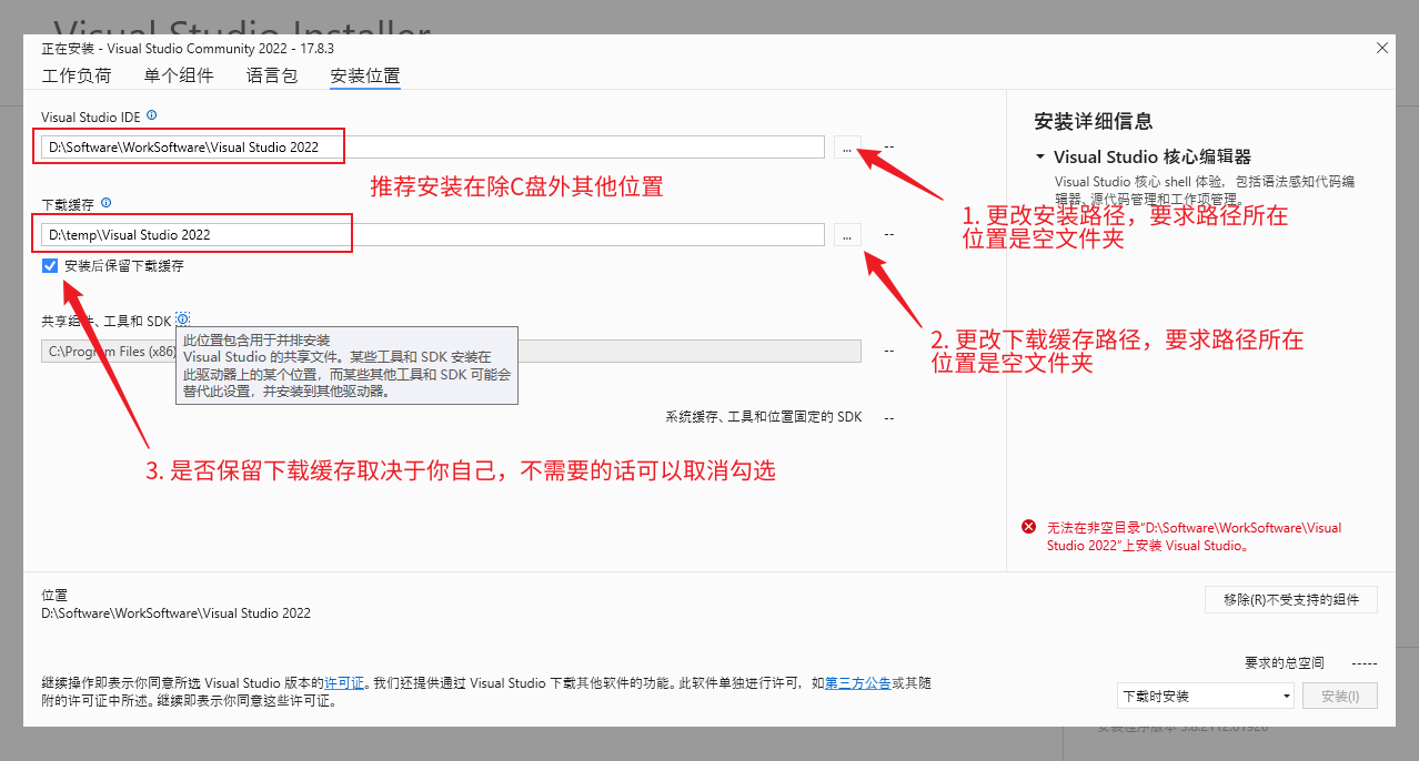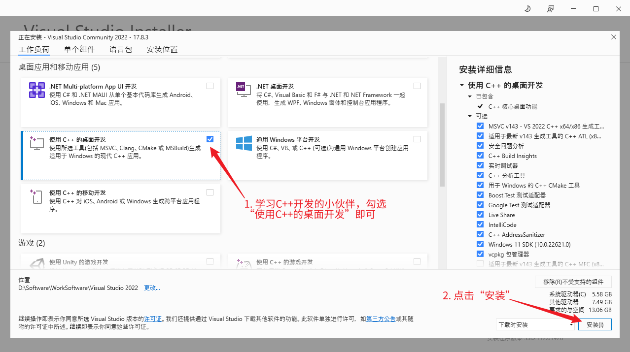 5. 点击左上角工作负荷,根据自己使用场景来安装,这里我要学习C++开发,只需要勾选使用C++的桌面开发,完成后点击右下角的安装: