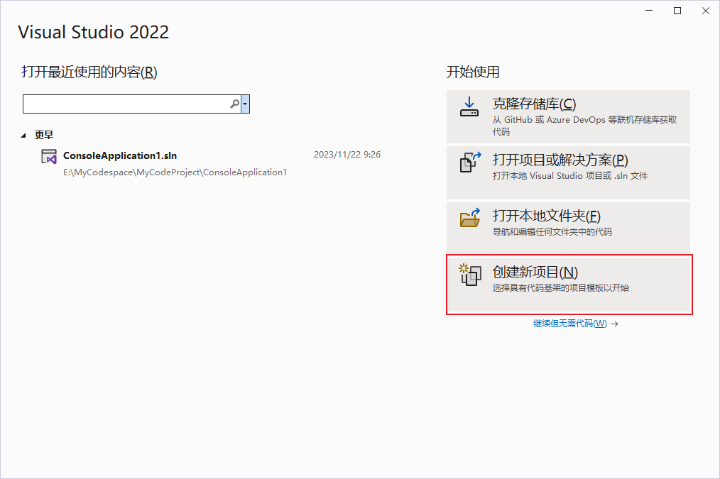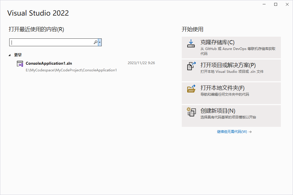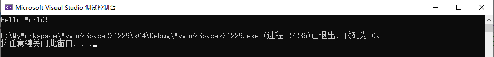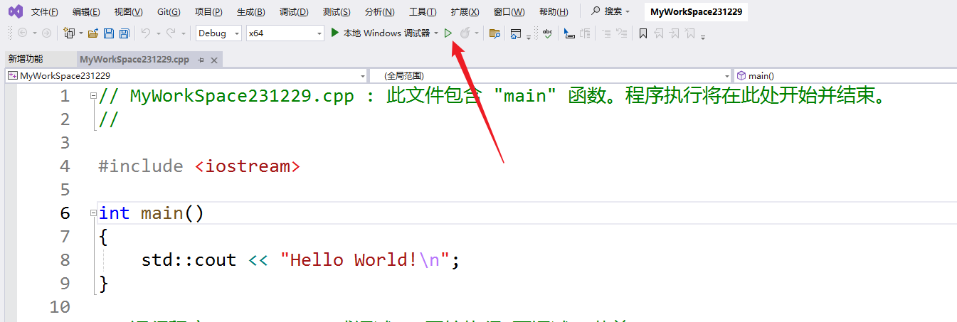 4. 进入编辑器界面以后,右侧解决方案资源管理器中已经为我们创建了一个实例文件:MyWorkspace231229.cpp,这个cpp文件我们点击上方的开始执行按钮(或者按CtrlF5)运行一下这个程序: