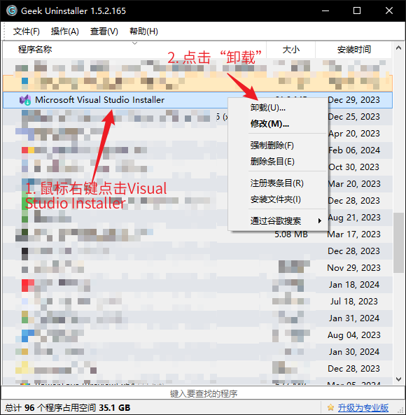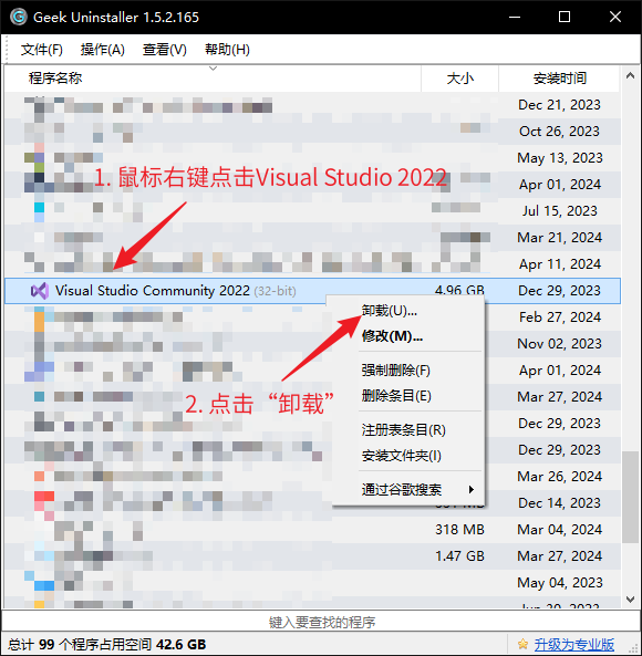 1. 打开Geek Installer,在程序列表中找到Visual Studio,鼠标右键,点击卸载: