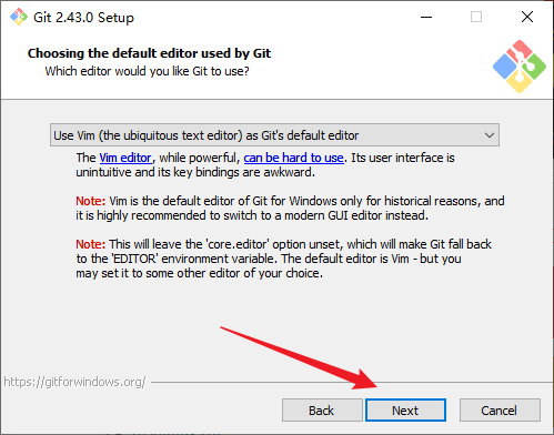 6. 默认编辑器选择Vim。点击Next: